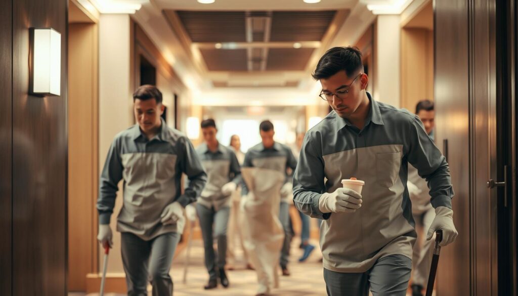 Đội ngũ nhân viên vệ sinh là yếu tố quan trọng trong việc cung cấp dịch vụ chất lượng. Đội ngũ nhân viên vệ sinh của chúng tôi có kinh nghiệm và kỹ năng chuyên môn. Họ sẽ làm việc cùng khách sạn để đảm bảo môi trường sạch sẽ cho khách hàng.